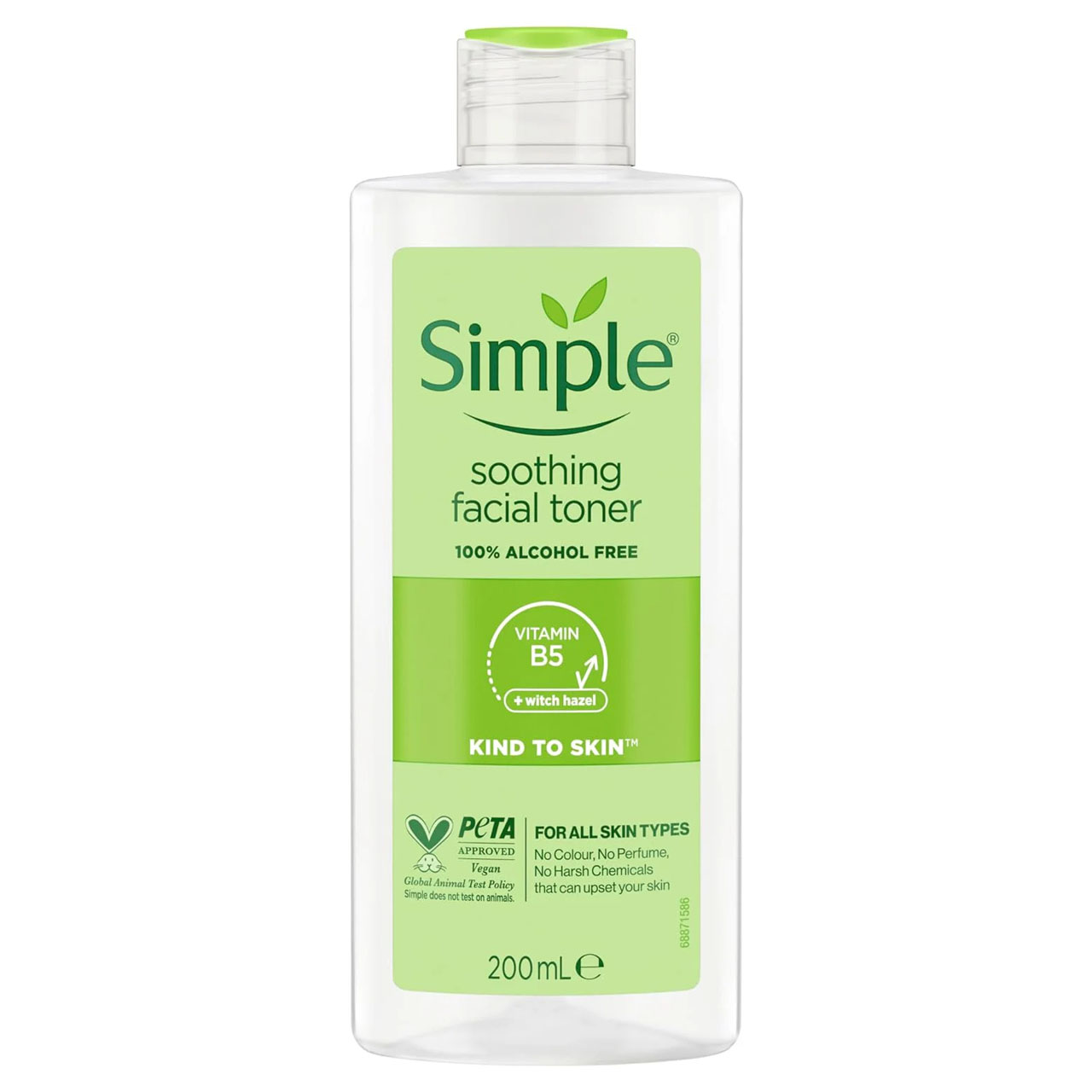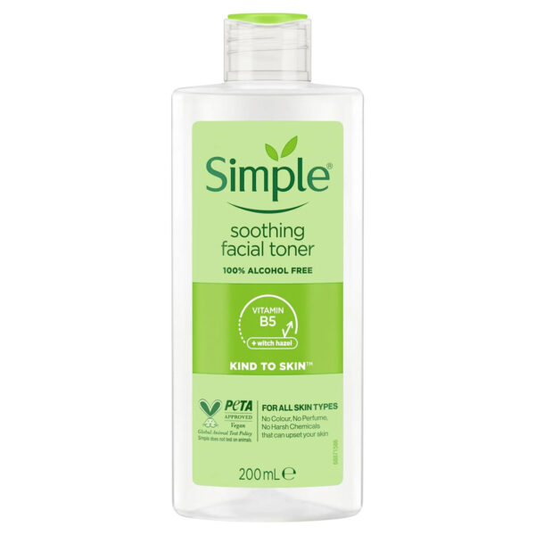 تونر سیمپل حاوی ترکیباتی مثل پرو ویتامین B5، بابونه، فندق افسونگر و آلانتوئین است که دارای خاصیت ضد التهابی و التیام بخشی هستند. این تونر فاقد الکل، عطر، رنگ و مواد شیمیایی خشن با پوست است و هیچ گونه آسیبی به پوست شما وارد نمی کند؛ همچنین غیر کومدون زا است و باعث بروز جوش نمی شود.